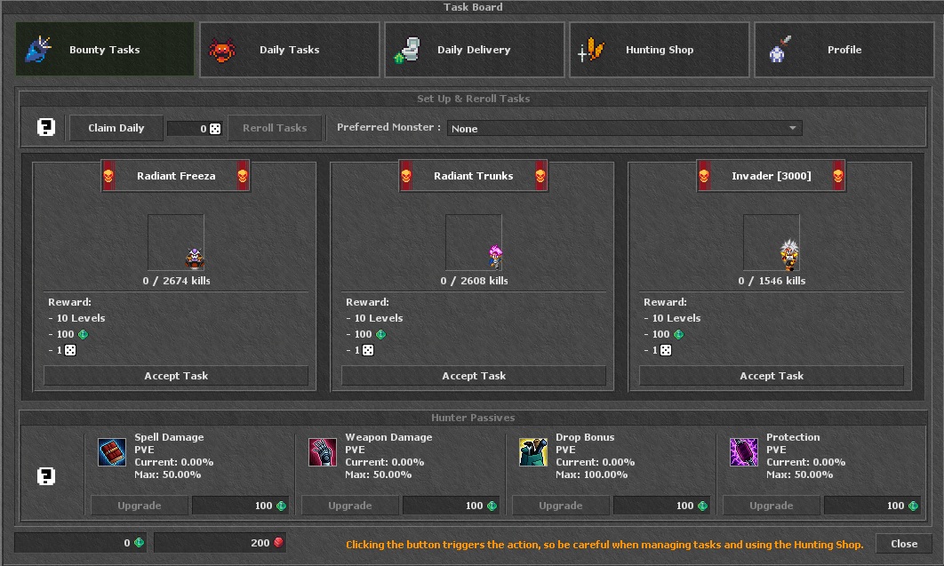Task System, replaces old Daily Tasks and NPC Taskman. Includes: Bounty Tasks (with Hunter Passives), Daily Tasks, Daily Delivery, Hunting Shop, and Profile tab with all key stats. Client Rework